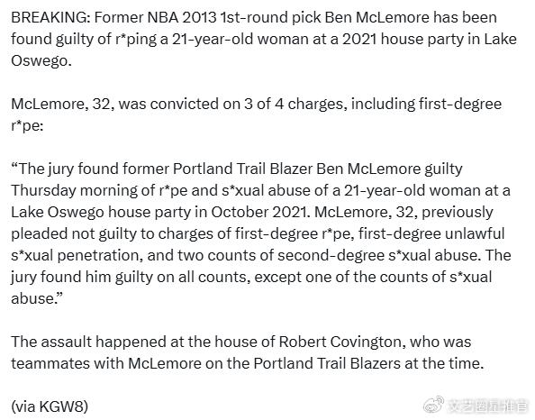 北京时间7月4日,据美媒《KGW新闻》报道,前NBA球员本-麦克勒摩因性侵案正式被判有罪,一级强奸罪和一级非法性侵罪名成立,面临8年监禁。